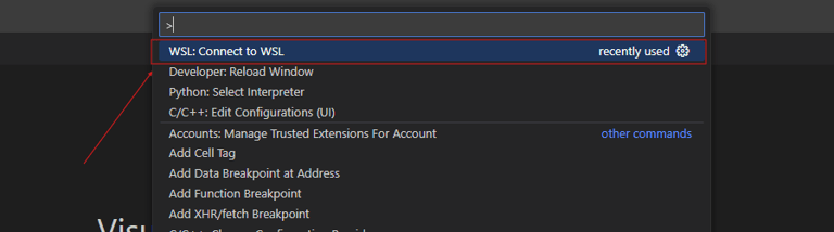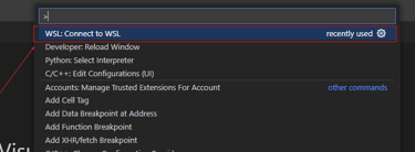 Next, open VSCode. Press "F1" to open the command tray and type "Connect to WSL." When you run the command for the first time, VSCode should install the required extension for WSL.